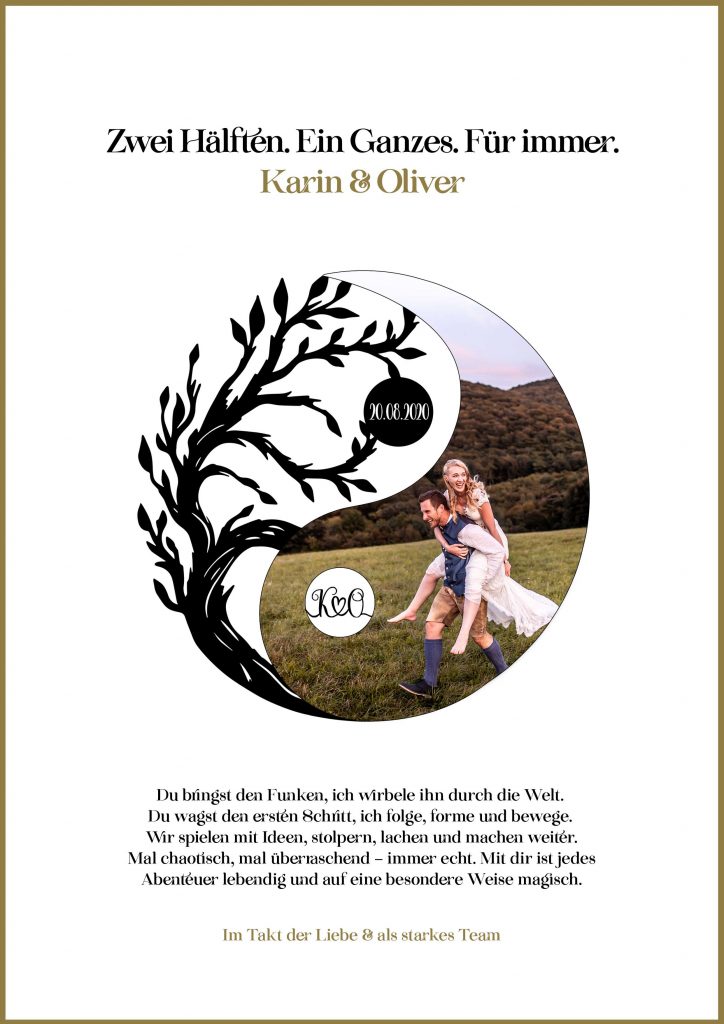 Dieses einzigartige Symbolbild vereint Yin & Yang mit einem lebendigen Baum – ein kraftvolles Zeichen eurer Verbindung. Es kann in euren Lieblingsfarben gestaltet werden, mit einem Bild aus eurem Shooting (oder einem, das ihr mir zuschickt), mit persönlichen Details wie Initialen, besonderen Daten oder sogar euren Kosenamen. So entsteht ein individuelles Kunstwerk, das eure Geschichte und eure Liebe auf besondere Weise sichtbar macht.